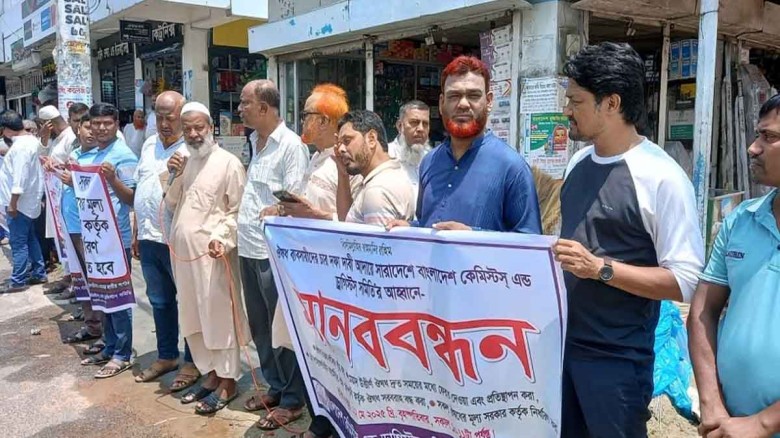 ঠাকুরগাঁওয়ে চার দফা দাবী আদায়ে ঔষধ ব্যবসায়ীদের মানববন্ধন...