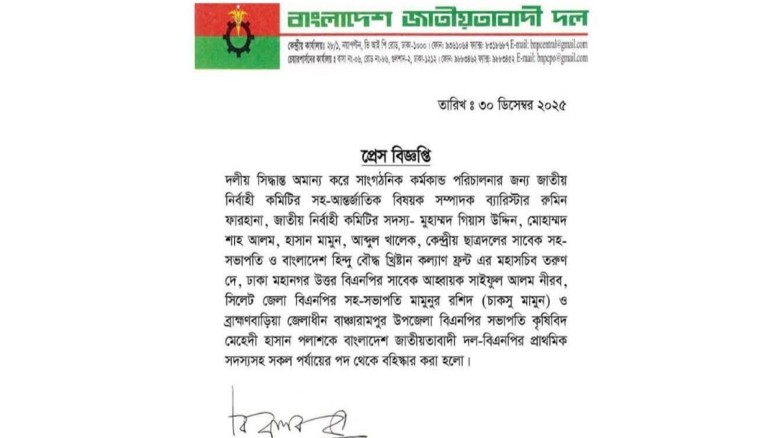 দলীয় সিদ্ধান্ত অমান্য করে সাংগঠনিক কর্মকান্ড পরিচালনার জন্য জাতীয় নির্বাহী কমিটির সহ-আন্তর্জাতিক বিষয়ক সম্পাদক ব্যারিস্টার রুমিন ফারহানা, জাতীয় নির্বাহী কমিটির সদস্য- মুহাম্মদ গিয়াস উদ্দিন, মোহাম্মদ শাহ আলম, হাসান মামুন, আব্দুল খালেক, কেন্দ্রীয় ছাত্রদলের সাবেক সহ-সভাপতি ও বাংলাদেশ হিন্দু বৌদ্ধ খ্রিষ্টান কল্যাণ ফ্রন্ট এর মহাসচিব তরুণ দে, ঢাকা মহানগর উত্তর বিএনপির সাবেক আহ্বায়ক সাইফুল আলম নীরব, সিলেট জেলা বিএনপির সহ-সভাপতি মামুনুর রশিদ (চাকসু মামুন) ও ব্রাহ্মণবাড়িয়া জেলাধীন বাঞ্চারামপুর উপজেলা বিএনপির সভাপতি কৃষিবিদ মেহেদী হাসান পলাশকে বাংলাদেশ জাতীয়তাবাদী দল-বিএনপির প্রাথমিক সদস্যসহ সকল পর্যায়ের পদ থেকে বহিস্কার করা হলো।