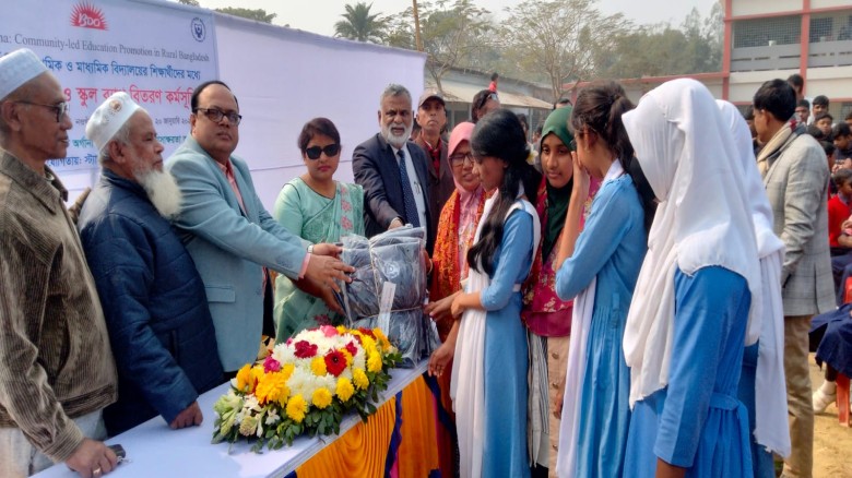দুপুরে বদলগাছি উপজেলার কোলা ইউনিয়নের ভান্ডারপুর দ্বি-মুখী উচ্চ বিদ্যালয় মাঠে আয়োজিত অনুষ্ঠানে প্রকল্পভুক্ত বিদ্যালয়গুলোর শিক্ষার্থীদের মাঝে মানসম্মত স্কুল ব্যাগ, শীতের পোশাক ও ল্যাপটপ বিতরণ করা হয়।