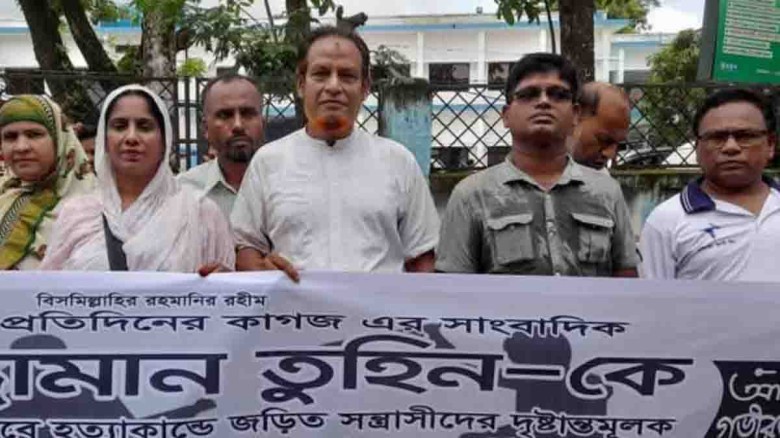 গাজীপুরে সাংবাদিক আসাদুজ্জামান তুহিন হত্যার প্রতিবাদে এবং হত্যাকারীদের দ্রুত গ্রেপ্তার ও দৃষ্টান্তমূলক শাস্তির দাবিতে চাঁপাইনবাবগঞ্জে মানববন্ধন অনুষ্ঠিত হয়েছে। রোববার (১০ আগস্ট) বেলা ১১টায় জেলা প্রশাসকের কার্যালয়ের সামনে চাঁপাইনবাবগঞ্জ সাংবাদিক সমাজের উদ্যোগে এ মানববন্ধন কর্মসূচি পালন করা হয়। মানববন্ধনে অংশ নেওয়া সাংবাদিক নেতারা বলেন, তুহিনের হত্যাকাণ্ড শুধু একজন সাংবাদিককে নয়, গণমাধ্যমের স্বাধীনতাকে আঘাত করেছে। এ হত্যাকাণ্ডের পেছনে থাকা সকল ব্যক্তিকে দ্রুত আইনের আওতায় এনে দৃষ্টান্তমূলক শাস্তি নিশ্চিত করতে হবে। নইলে সারাদেশের সাংবাদিকরা কঠোর আন্দোলনে যেতে বাধ্য হবে।