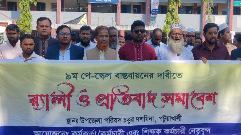 বেতন বৈষম্য দূরীকরণ এবং নবম পে-স্কেল বাস্তবায়নের দাবিতে পটুয়াখালীর দশমিনায় র্যালি ও প্রতিবাদ সমাবেশ করেছেন সরকারি কর্মকর্তা-কর্মচারীরা।